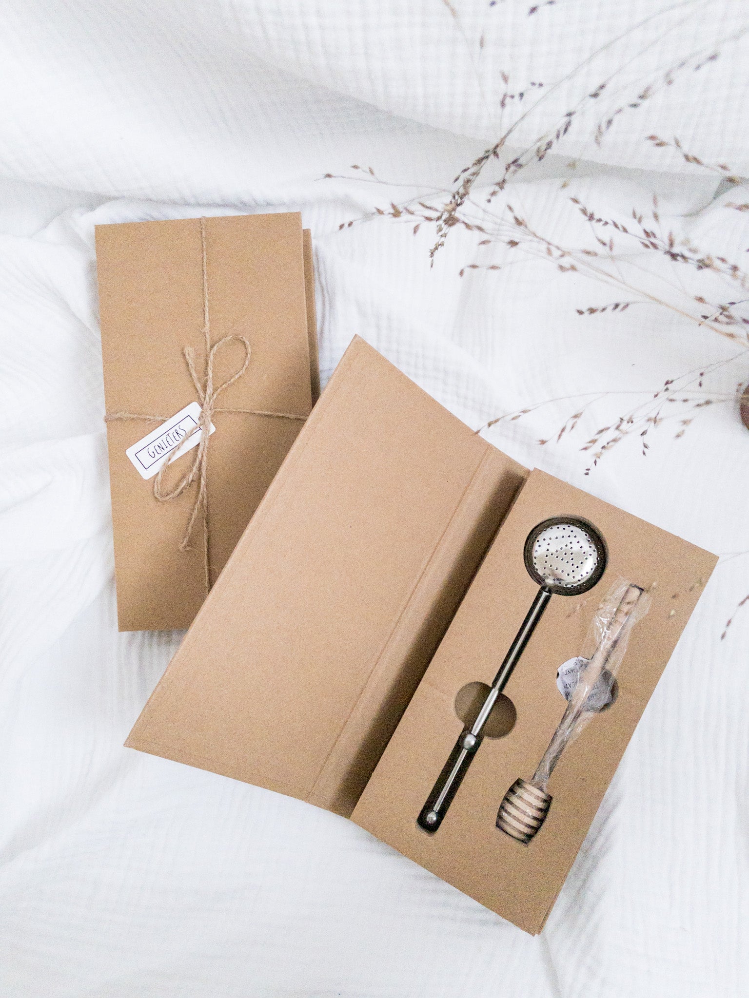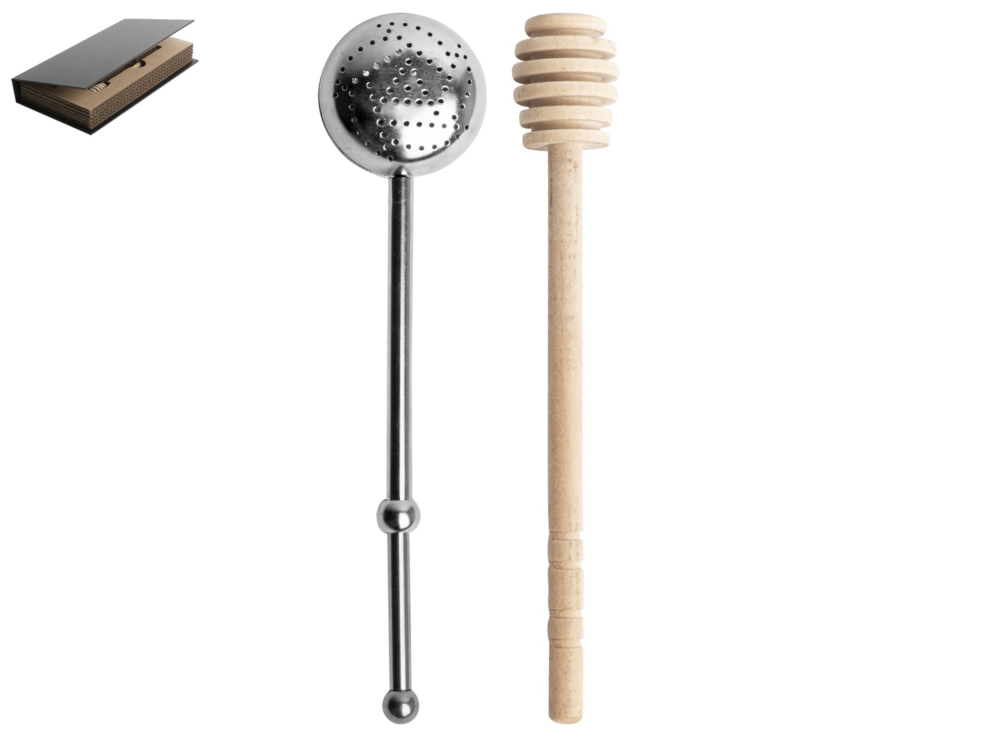 Verse thee zet je met het metalen thee-ei en honing voeg je rijkelijk toe met de houten honinglepel. Leuk voor iedereen die zo kan genieten van een verse kop thee.